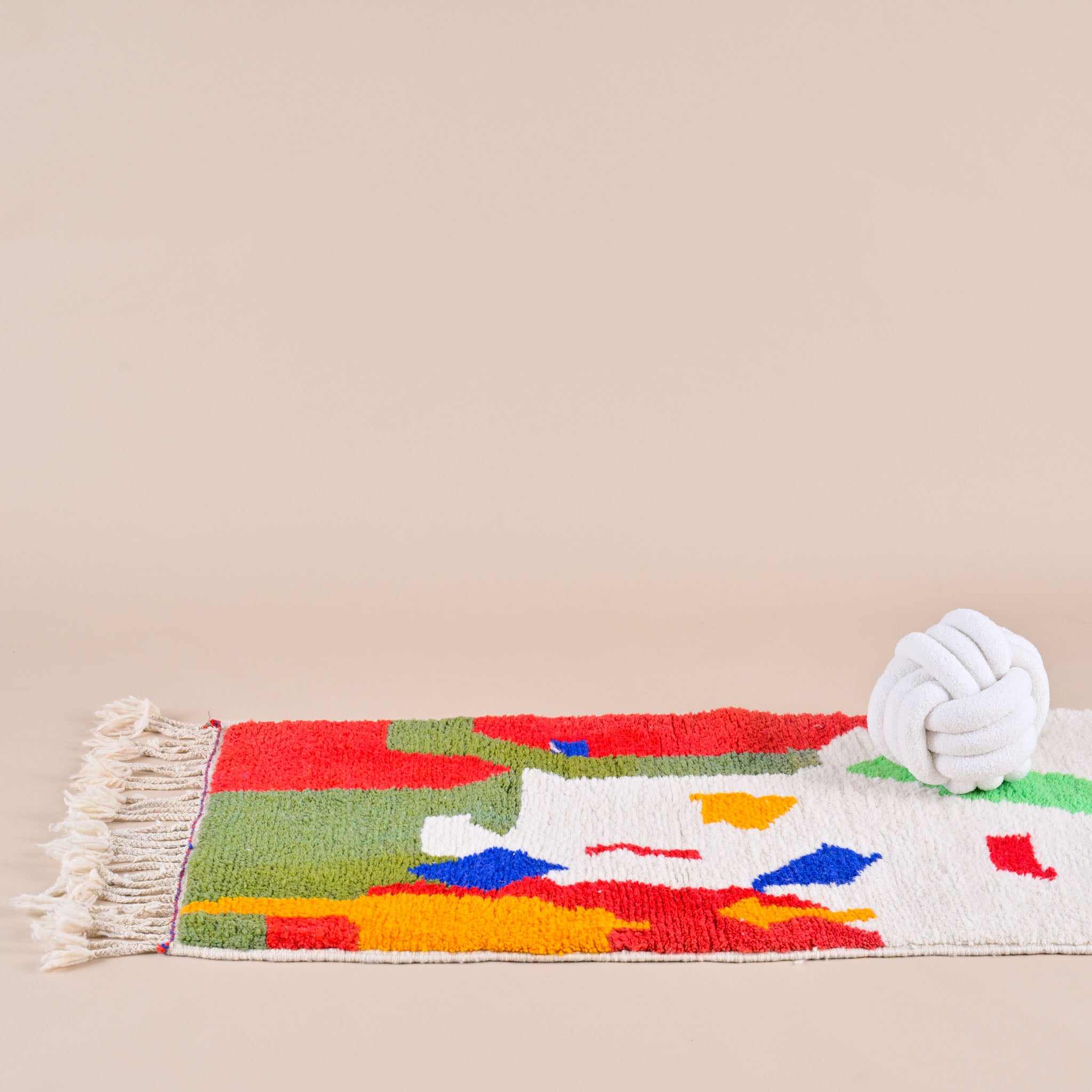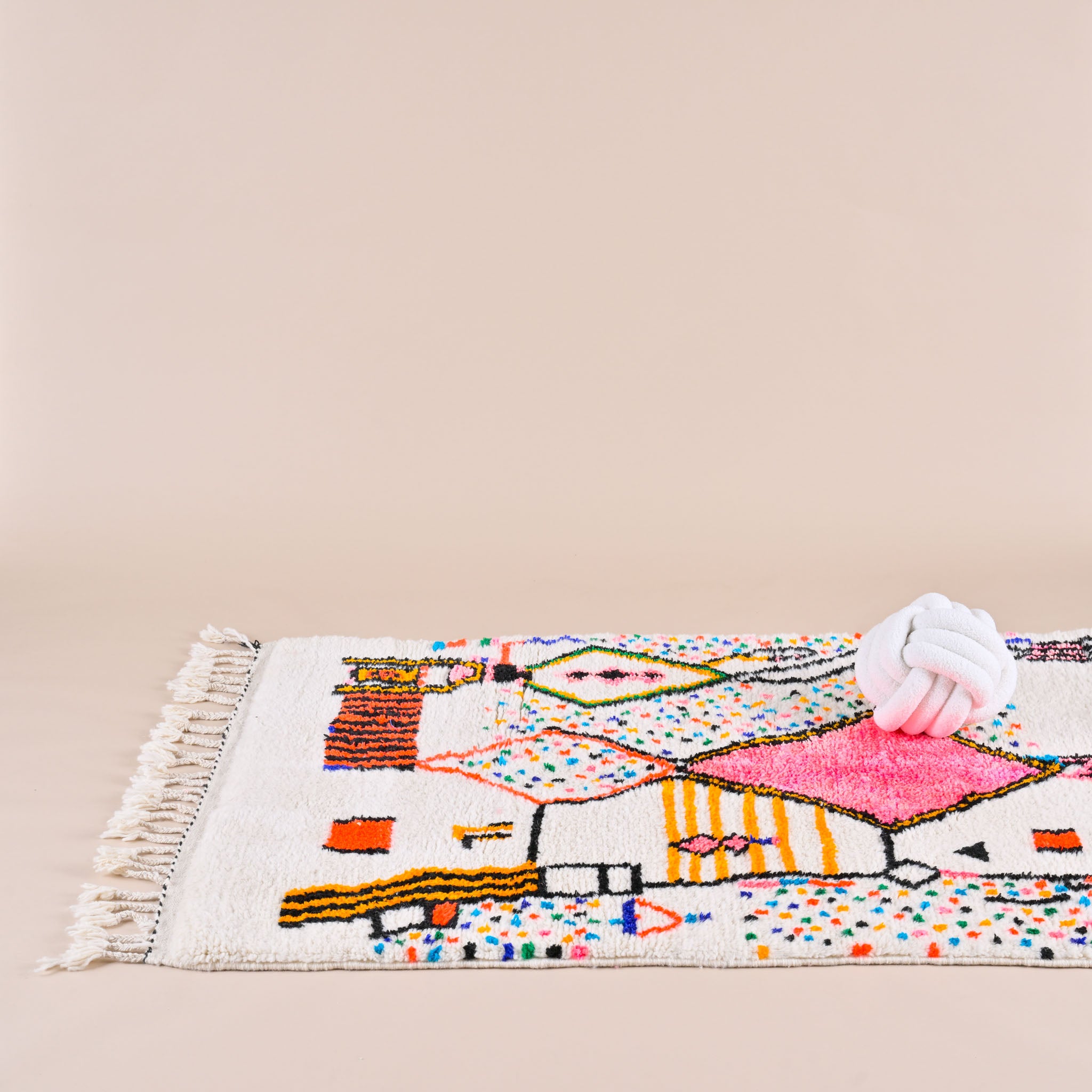 Originaire de la région d'Azilal, ce tapis est connu pour ses motifs abstraits et ses couleurs vives, rendant chaque pièce unique. Leur fond blanc et les motifs abstraits colorés en font un choix préféré pour ajouter une touche de fantaisie à tout espace.