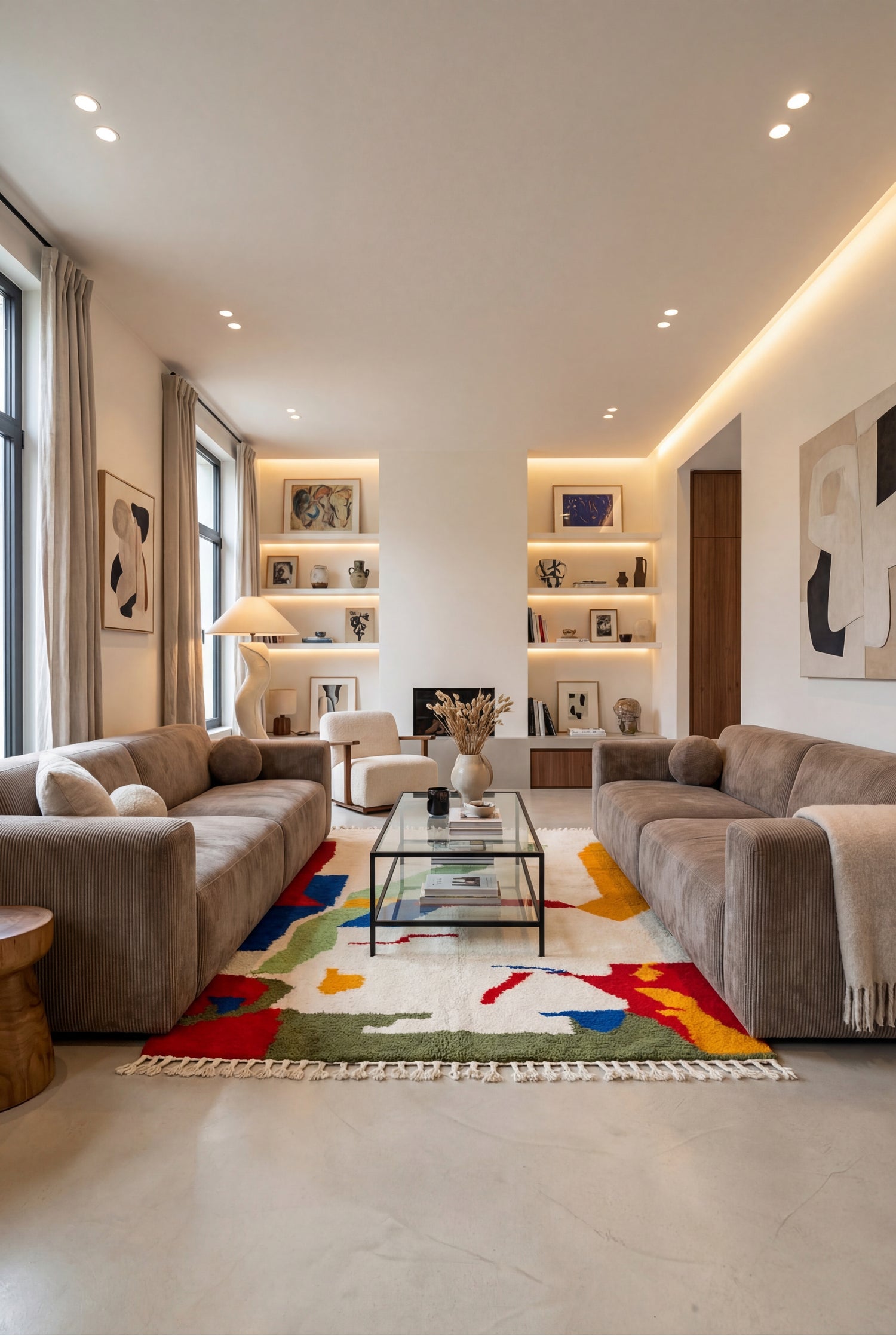 Séjour ou pièce à vivre ouverte — Dans un espace ouvert cuisine-salon, le grand tapis Azilal est l'outil le plus efficace pour délimiter visuellement la zone de vie sans poser de cloison. Son format généreux crée un « îlot » de confort et de couleur qui structure l'espace tout en laissant la circulation fluide. Laissez 30 à 50 cm de sol visible entre les bords du tapis et les murs ou le début de la zone cuisine.