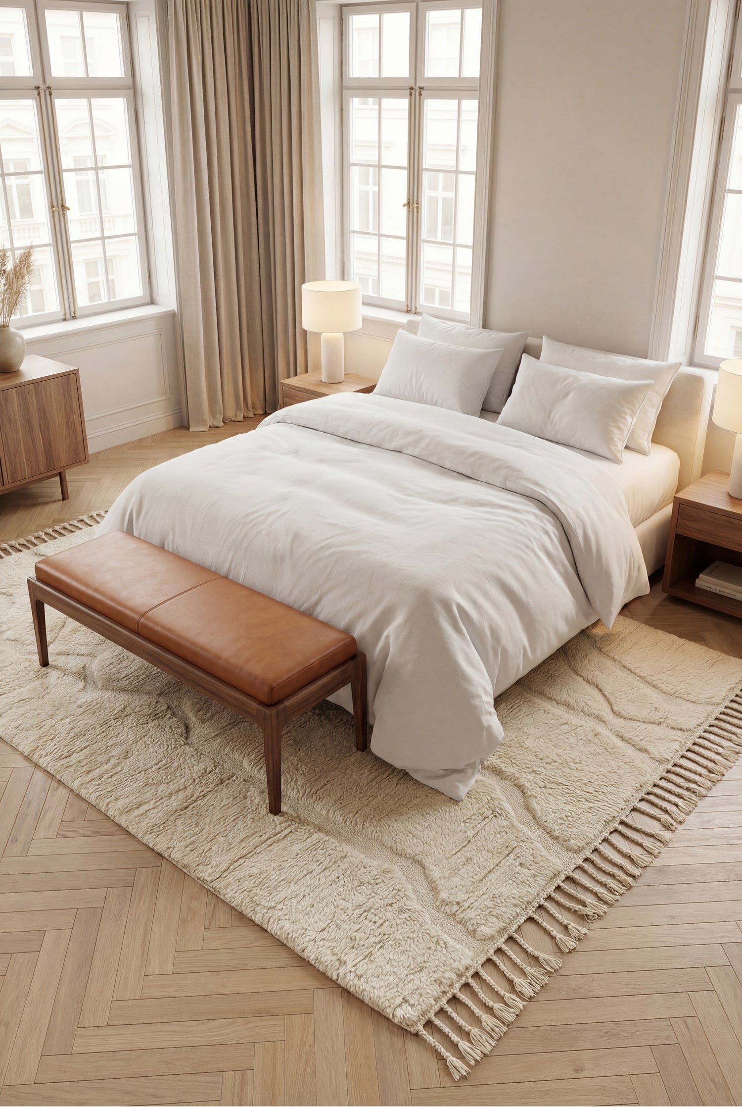 Grande chambre ou suite parentale, Un grand Beni Ouarain posé sous le lit, avec un large débordement de chaque côté, transforme la chambre en cocon de douceur. Au réveil, vos pieds se posent directement sur un nuage de laine, un rituel de confort quotidien. Le blanc crème renforce l'ambiance apaisante et propice au sommeil.