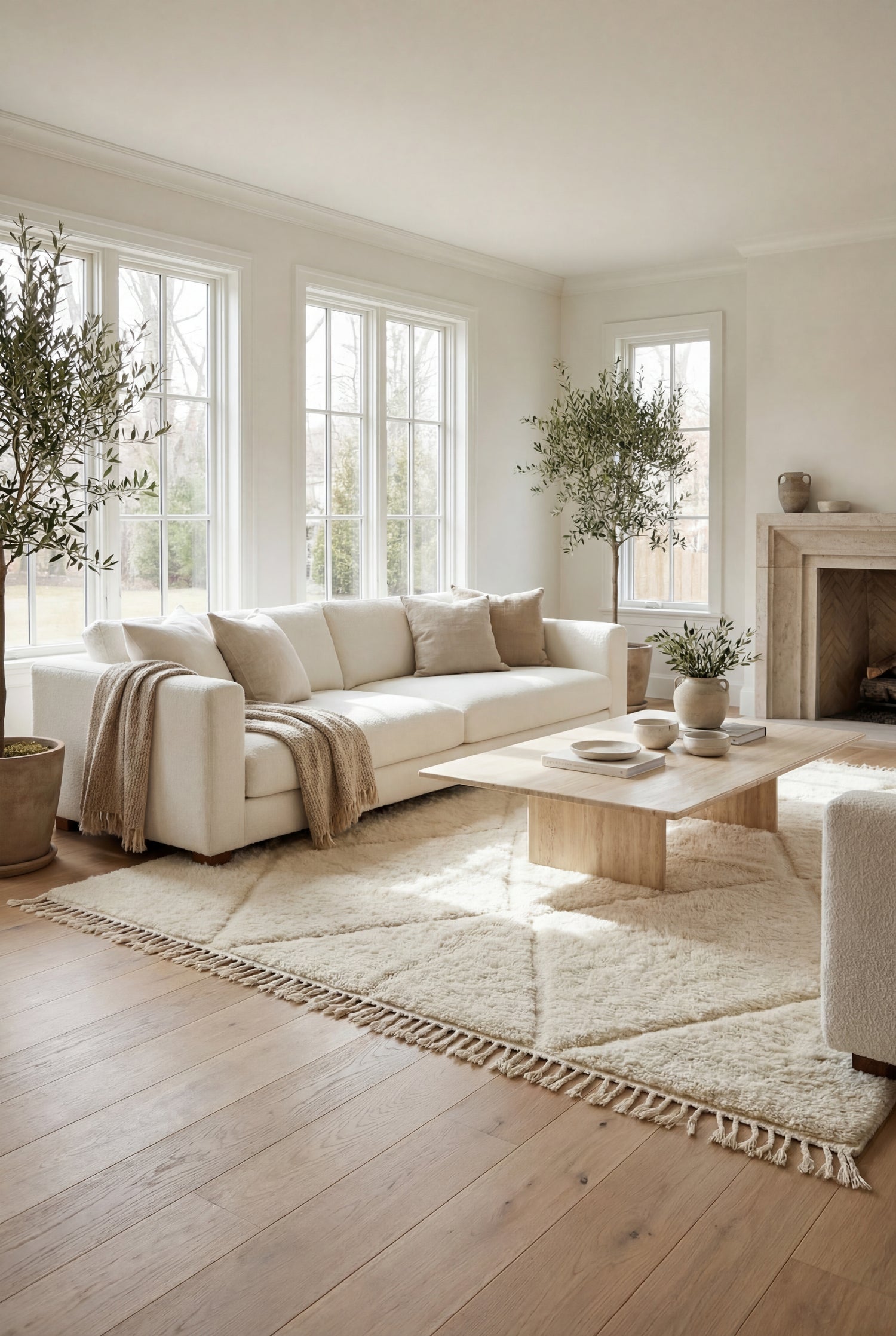 Le tapis Beni Ouarain est le tapis berbère le plus demandé en sur mesure, et pour une bonne raison. Son esthétique sobre et épurée (blanc crème, motifs géométriques noirs, poil long) s'intègre dans les intérieurs où chaque proportion compte : espaces scandinaves, minimalistes, japandi, contemporains. Dans ces décors épurés, un tapis trop petit ou trop grand se remarque immédiatement. Le sur mesure garantit des proportions parfaites, le tapis s'intègre dans l'espace comme s'il avait toujours été là.